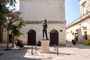In front of the town hall, there is the monument to Francesca Capece. This splendid work in white Carrara marble was created by Antonio Bortone da Ruffano. The statue depicts Francesca Capece, last feudatory of Maglie, who, sitting on an armchair, comforts a child who, in his right hand has the symbol of faith, a cross and a book that represents knowledge. In his left hand, the child has a shield, which represents strength. These themes, as mentioned above, were dear to Francesca Capece. For this reason she gave all her possessions to the youth culture. This work was inaugurated in 1900.Statue and the house of Aldo Moro