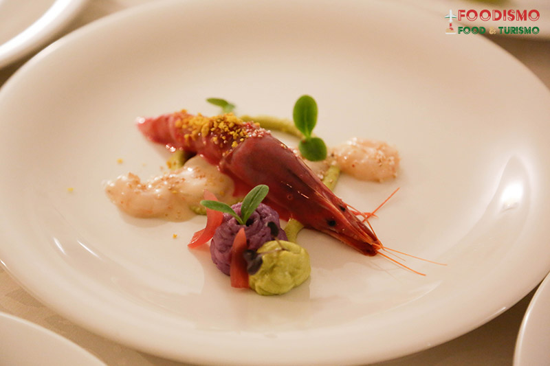 Il gambero rosa marinato con una vinaigrette di zenzero e lime e granella di Friscous, mentre il gambero viola è stato finemente marinato con un dressing di aloe vera, melograno e amaranto soffiato.
